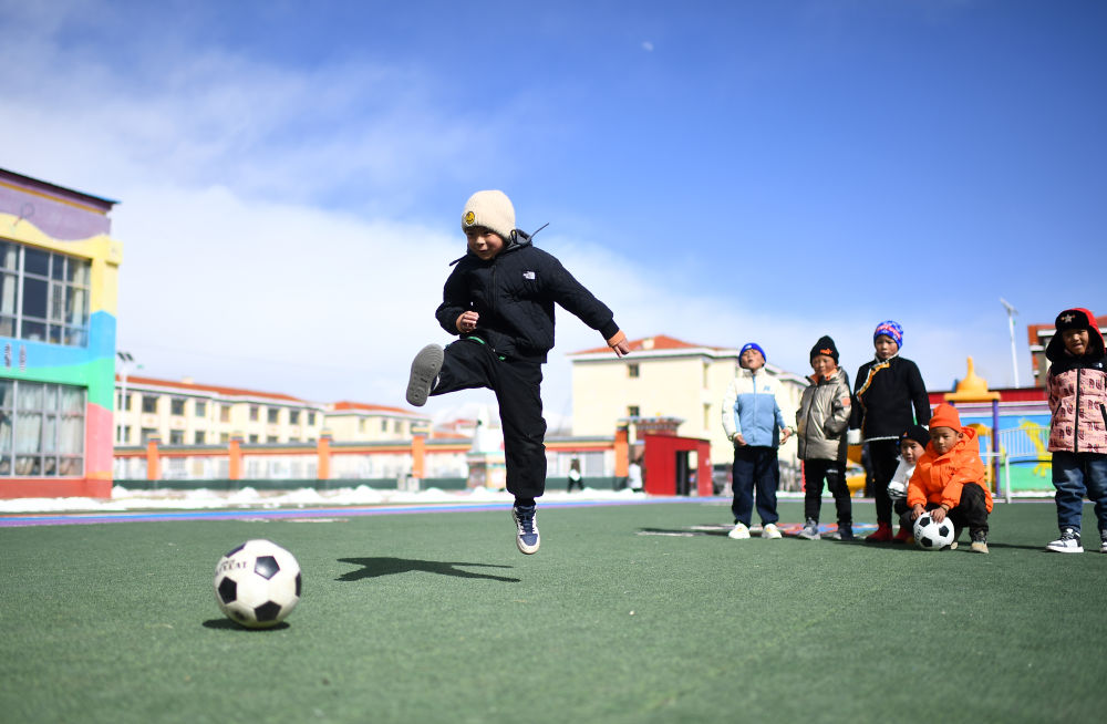3月1日,在玉樹州治多縣,城南幼兒園小朋友旦增然桑(左一)在練習(xí)射門。新華社記者 張宏祥 攝