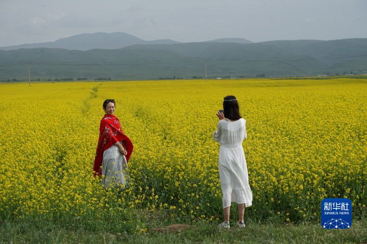 游人在青海湖畔的油菜花田邊賞花留影(2022年7月9日攝)。新華社記者 王大千 攝