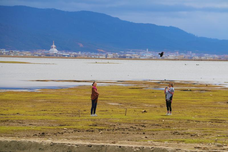 春分節(jié)氣前后,香格里拉氣溫回暖,納帕海的草原也逐漸染綠,游客們在欣賞草原春景的同時(shí)也不忘合影留念。