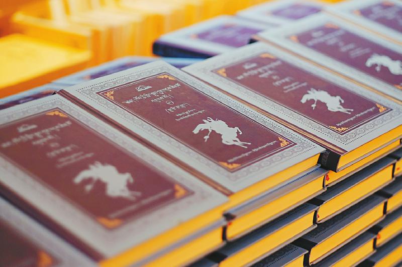 《格薩爾王全集》的裝幀,封面是比較特別的,有云紋做背景,書的背脊,一邊是書名和編號(hào),另一邊是由十余幅格薩爾唐卡拼接而成,書頁(yè)上端的空白和紙邊之間采用了金色滾邊的工藝。[詳細(xì)] -