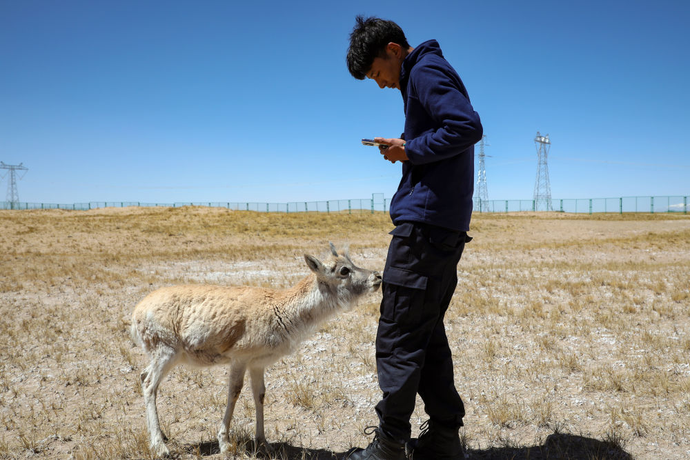 4月15日,巡山隊(duì)員才文多杰在拍攝小藏羚羊生長情況影像。新華社記者黃豁 攝