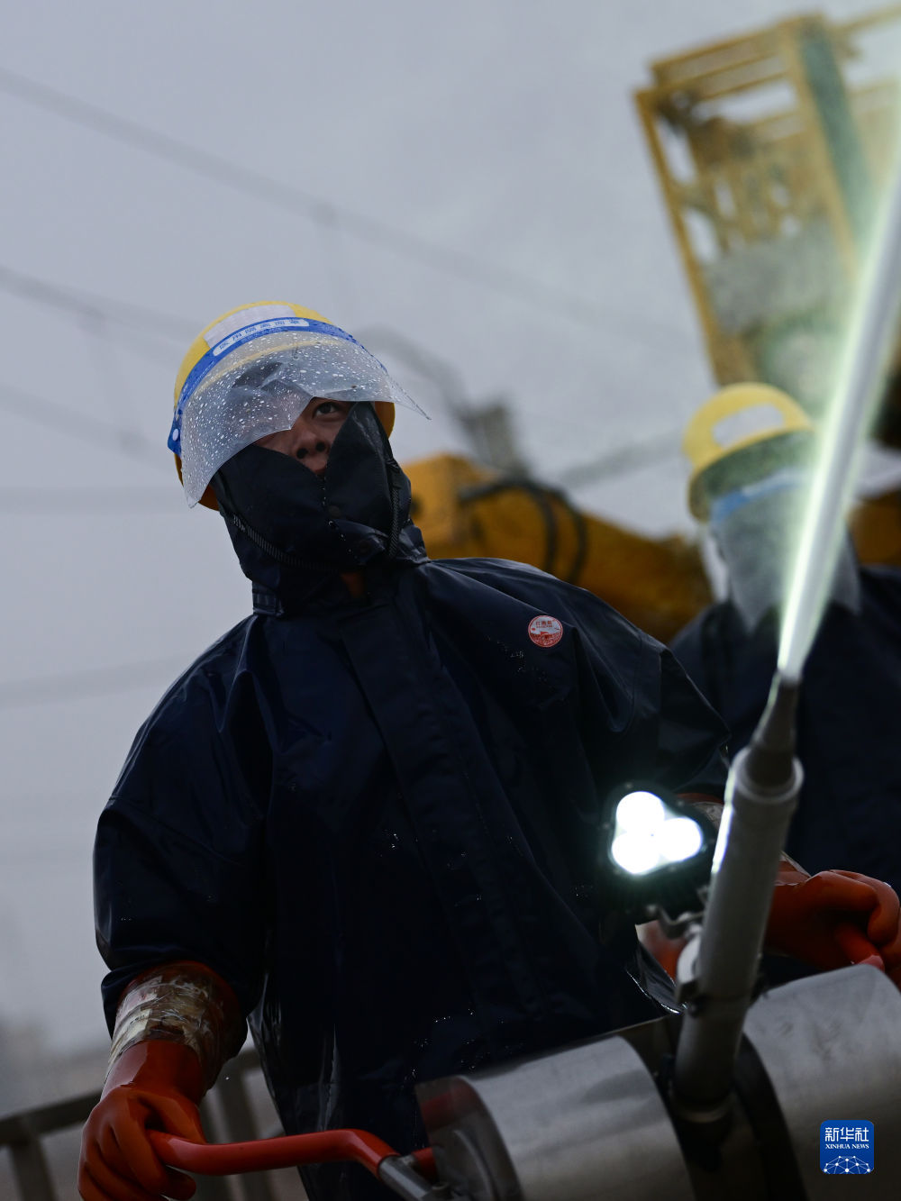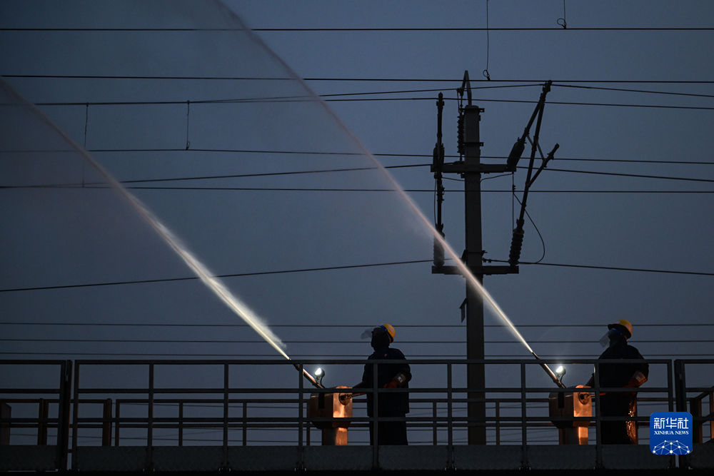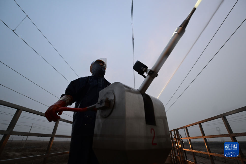 4月20日,中國鐵路青藏集團有限公司西寧供電段格爾木大修車間大修網工區(qū)檢修工王家彤使用高壓沖洗水槍對絕緣子設備進行清洗。新華社記者 張龍 攝