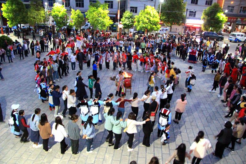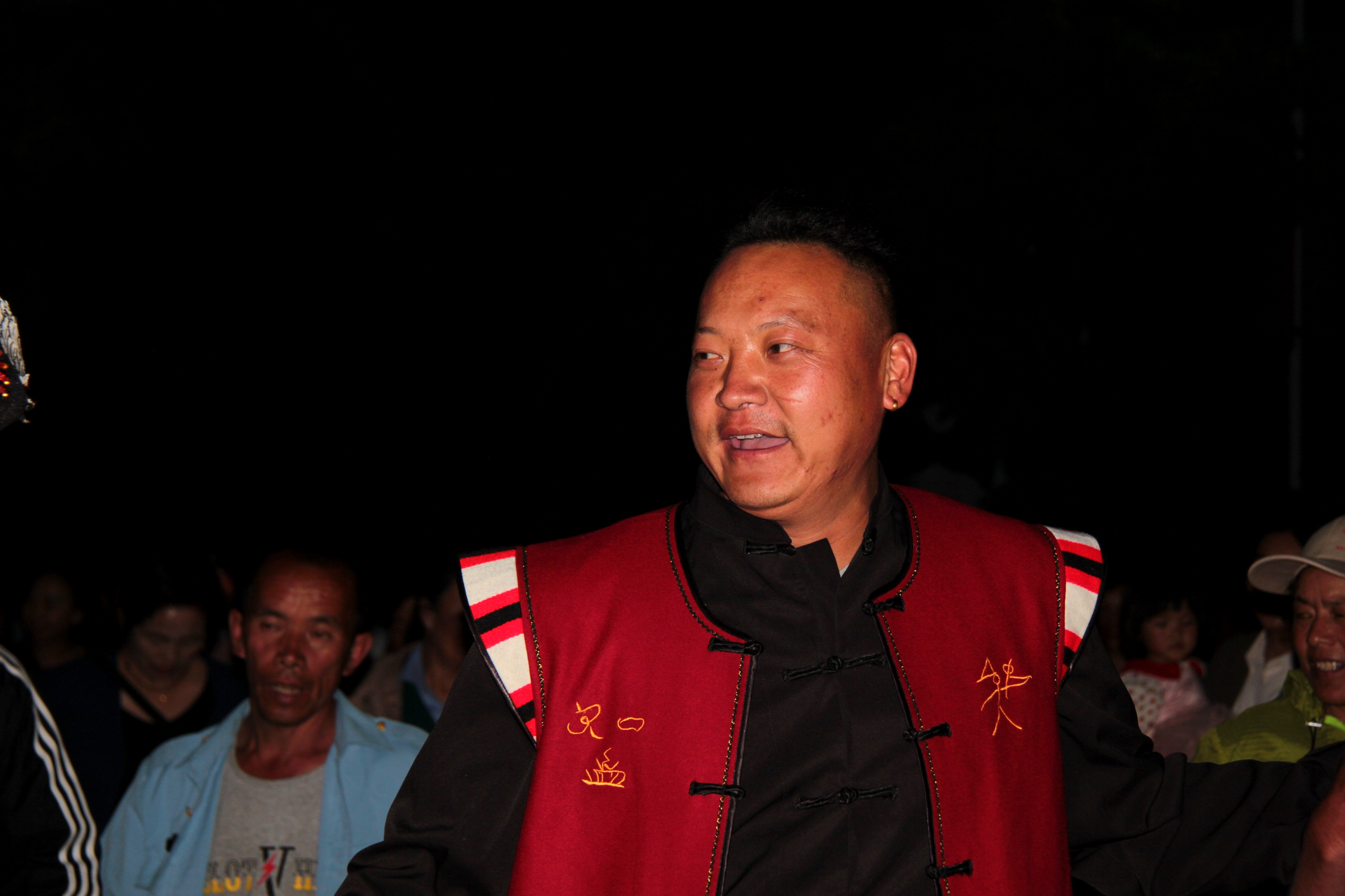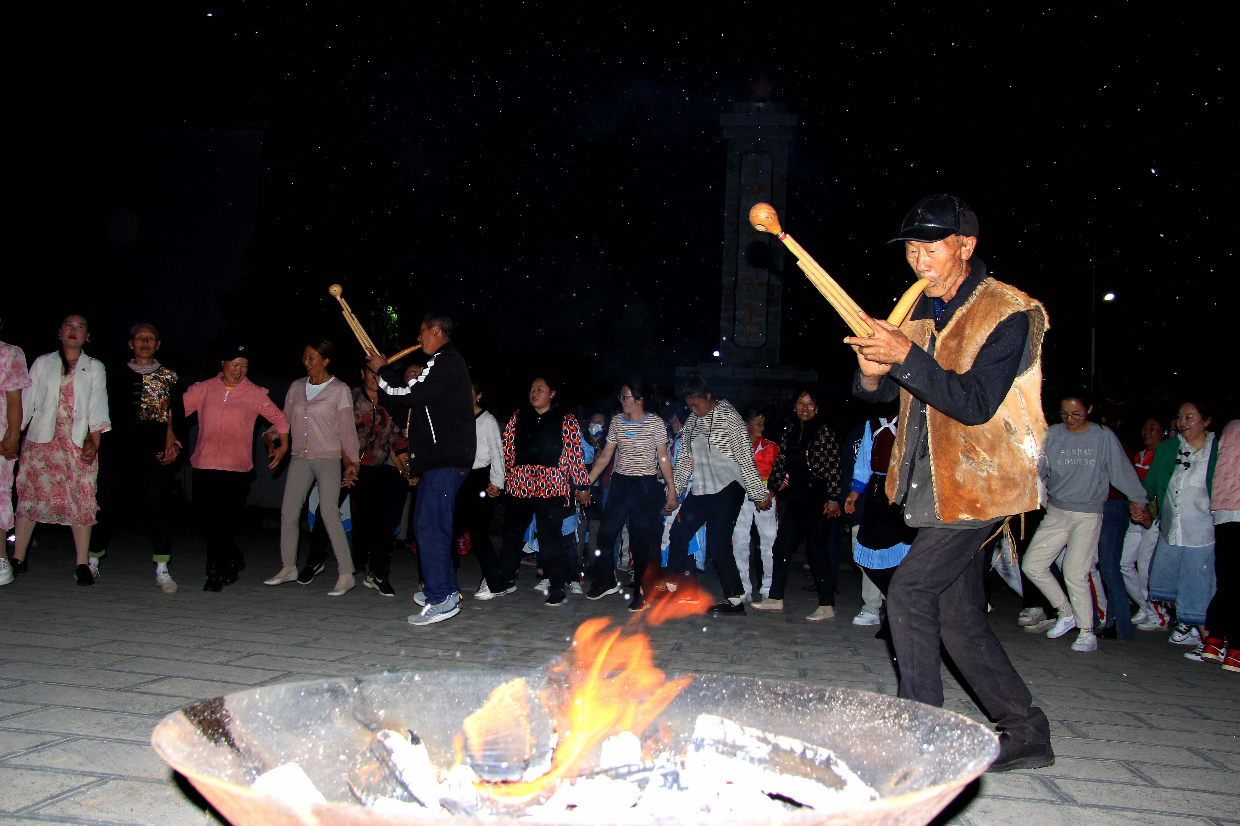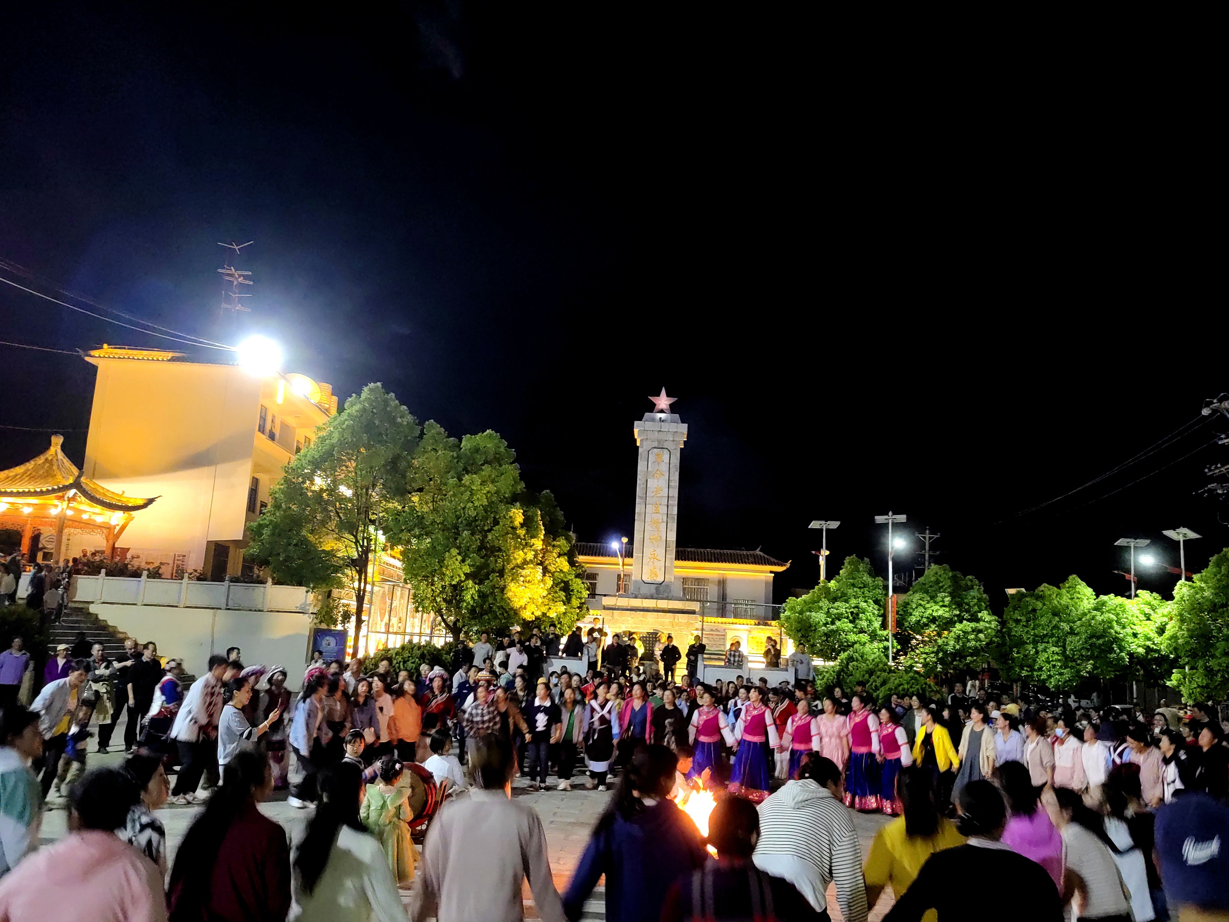打跳開始了,不斷有圍觀群眾參與到打跳當(dāng)中,打跳選手手牽手把篝火圍了三四圈,篝火的映照下,大家臉上的笑容又燦爛了幾分。打跳歌曲從勁爆葫蘆絲換到納西三部曲又換到大蠻調(diào),換了無數(shù)首,而參與群眾仿佛不知疲倦一直激情打跳著,現(xiàn)場非?;馃?。