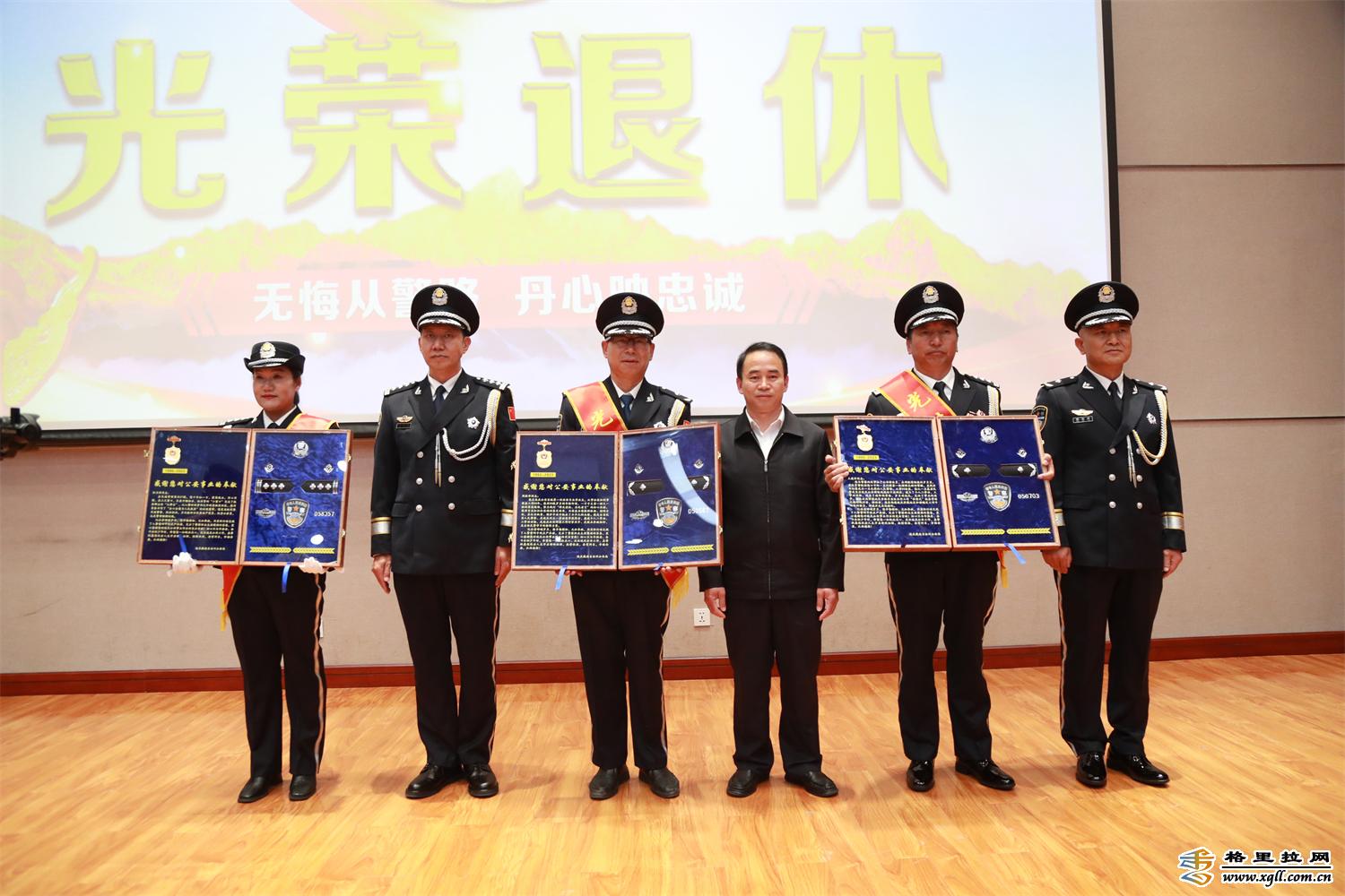 儀式上,迪慶州公安局相關(guān)領(lǐng)導(dǎo)為退休同志頒發(fā)了退休紀念章,還將退休民警各自的警徽、肩章等物品裝裱成冊贈與4位退休同志留作紀念。