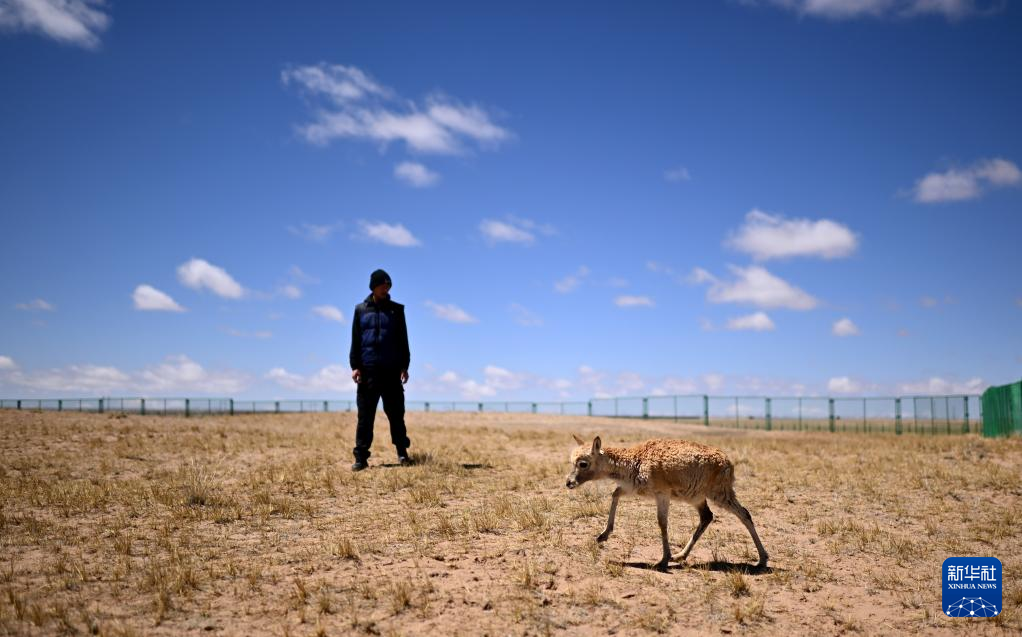 在可可西里國(guó)家級(jí)自然保護(hù)區(qū)索南達(dá)杰保護(hù)站,巡山隊(duì)員扎西桑周在野生動(dòng)物救助中心內(nèi)與一只被救助的小藏羚羊互動(dòng)(5月30日攝)。 新華社記者 張宏祥 攝