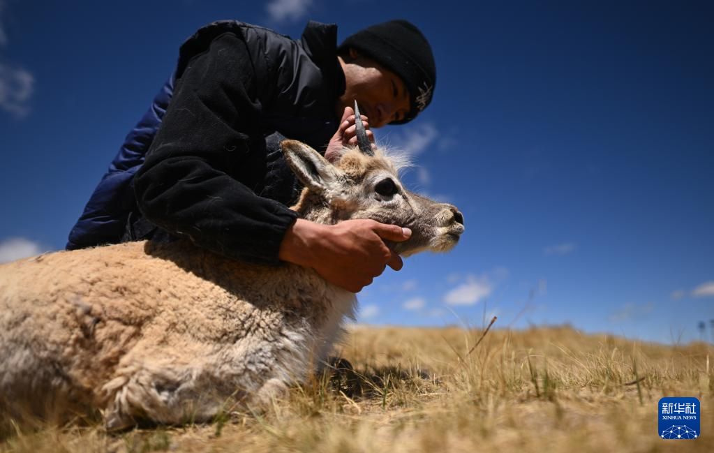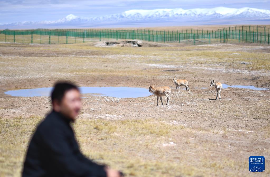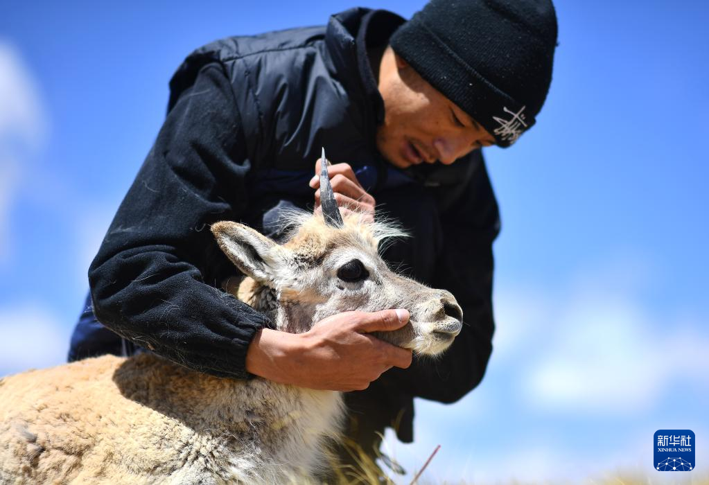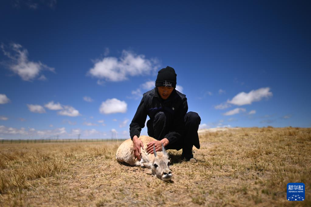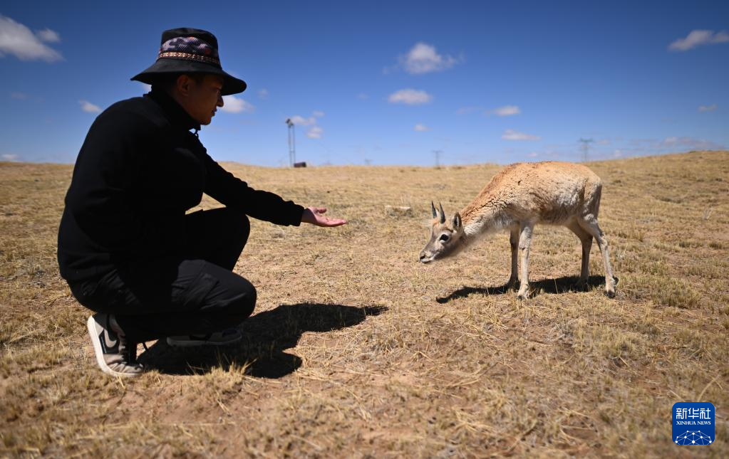 5月30日,在可可西里國(guó)家級(jí)自然保護(hù)區(qū)索南達(dá)杰保護(hù)站,巡山隊(duì)員才文多杰和藏羚羊在一起?!⌒氯A社記者 薛玉斌 攝