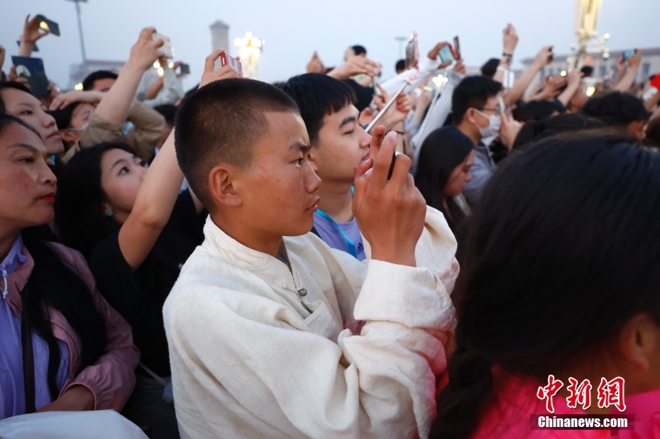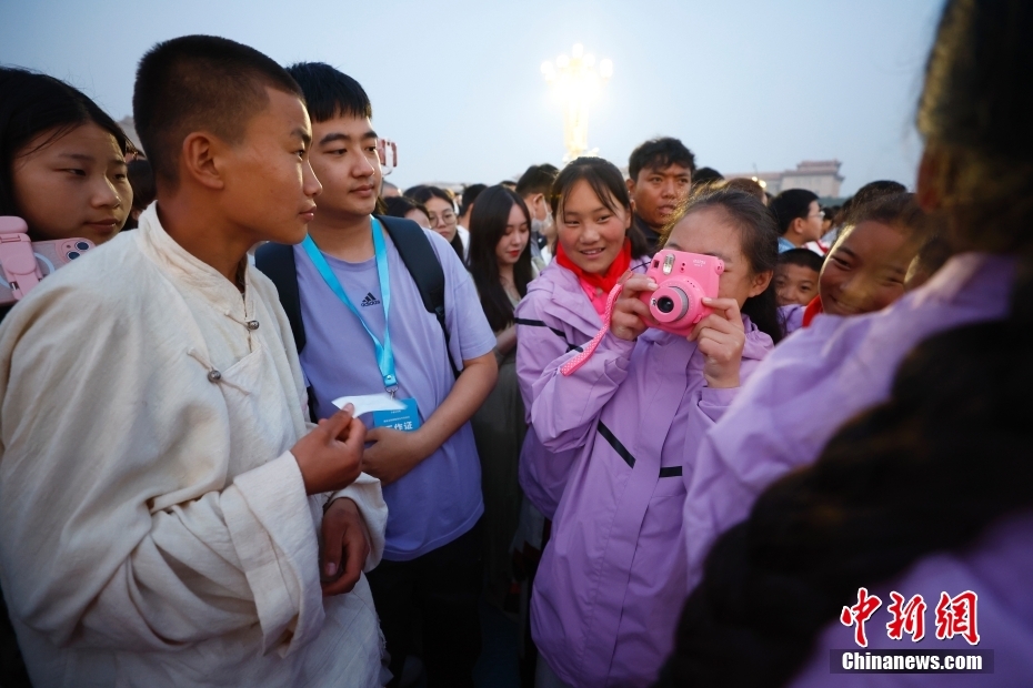圖為青少年在天安門(mén)廣場(chǎng)看升旗。中新社記者 富田 攝