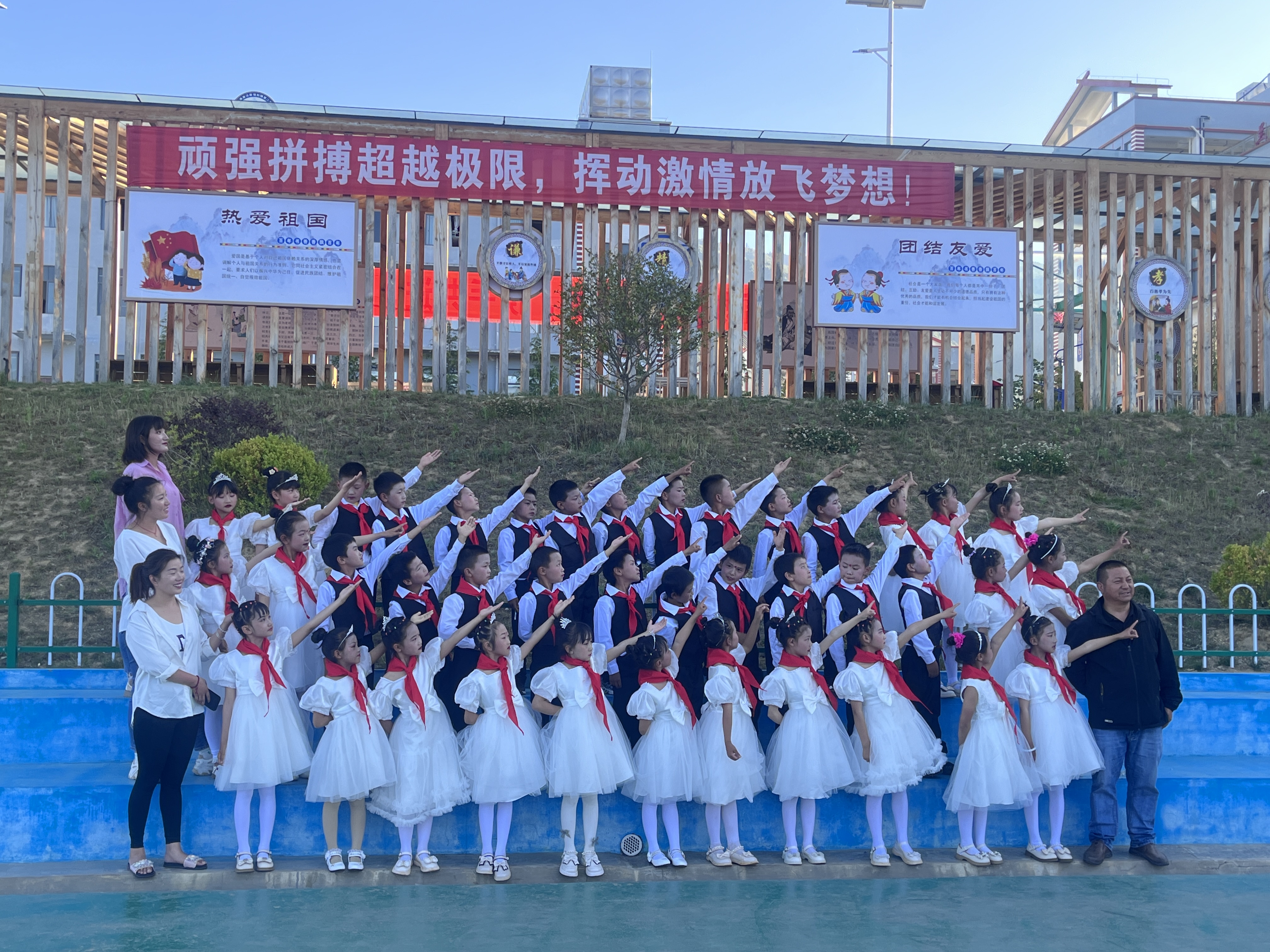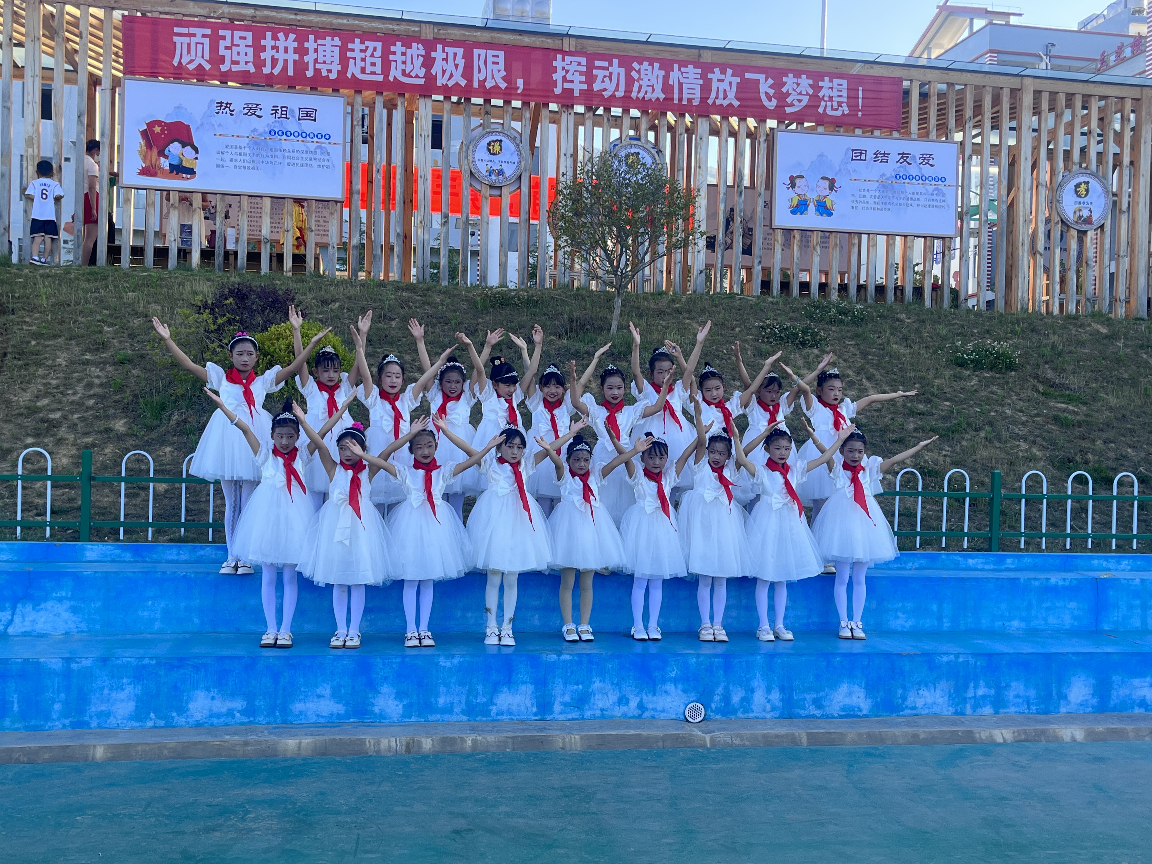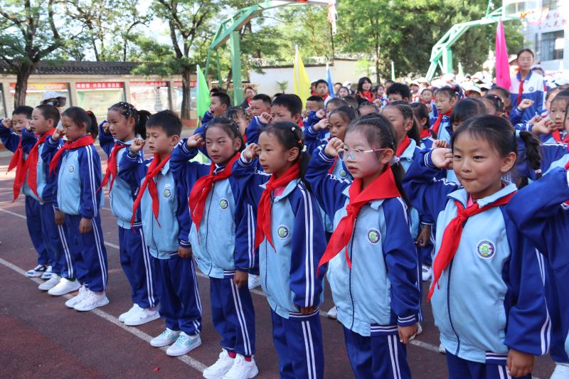 上午8點30分,活動正式開始,升國旗、唱國歌、行隊禮,孩子們激動的心情溢于言表。在新隊員入隊儀式上,共有138名學(xué)生加入光榮的中國少年先鋒隊組織,老隊員們?yōu)樗麄兣宕骷t領(lǐng)巾,鮮艷的紅領(lǐng)巾在新隊員的胸前飄揚,也在燦爛的朝陽下熠熠閃光。隨后,該校對獲得“2022—2023年度“優(yōu)秀少先隊員”“優(yōu)秀班干部”“紅領(lǐng)巾一星獎?wù)聵s譽”的同學(xué)進行了表彰。最后,學(xué)校舞蹈社團的孩子們?yōu)榇蠹規(guī)砭实母栉璞硌荩颜麄€活動推向高潮。 (張燕 攝影報道)