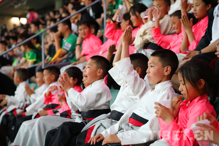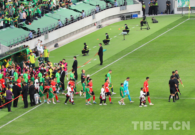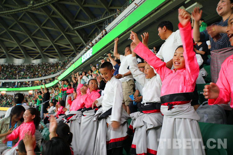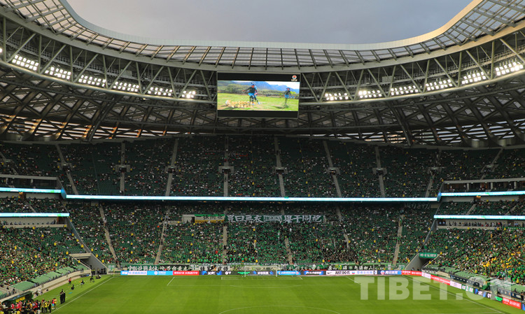 阿斌與5名小伙伴身著藏裝,牽手球員出現(xiàn)在賽場(chǎng)上,頓時(shí)吸引了全場(chǎng)目光。大屏還播放著三江源·北京情·中國(guó)心——青海玉樹(shù)藏族青少年北京行”的視頻,展示著雪域足球少年的風(fēng)采,環(huán)形LED屏幕用中文、藏文雙語(yǔ)滾動(dòng)播放著40位玉樹(shù)少年的名字。