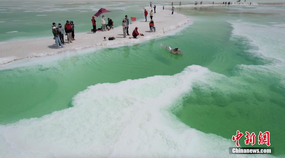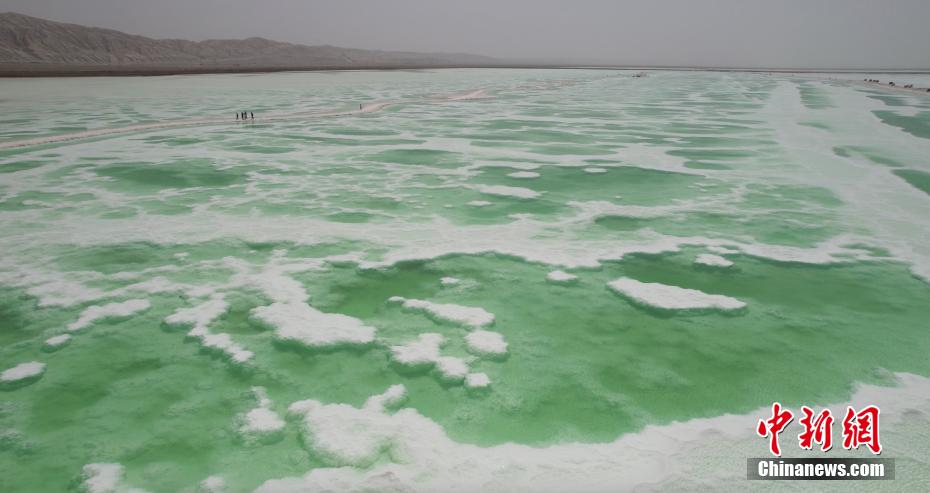 夏日,位于青海海西州茫崖市花土溝鎮(zhèn)的翡翠湖宛如色彩絢麗的油畫被描繪在蒼茫的柴達(dá)木盆地上,淡青、翠綠、深綠色的湖水如碎玉散落在大漠戈壁上,充滿生機(jī)。茫崖翡翠湖南依昆侖山,北靠阿爾金山,總面積約26平方公里,屬于硫酸鎂亞型鹽湖,由于所含礦物質(zhì)濃度的不同,致使湖面顏色深淺不一。18日,由中新社青海分社,青海省海西州茫崖市委、茫崖市人民政府共同主辦的“赴蒼茫之崖品人間煙火”青海·茫崖2023美食大會在茫崖市正式啟動。近日,活動團(tuán)隊(duì)來到茫崖翡翠湖進(jìn)行拍攝采風(fēng)。