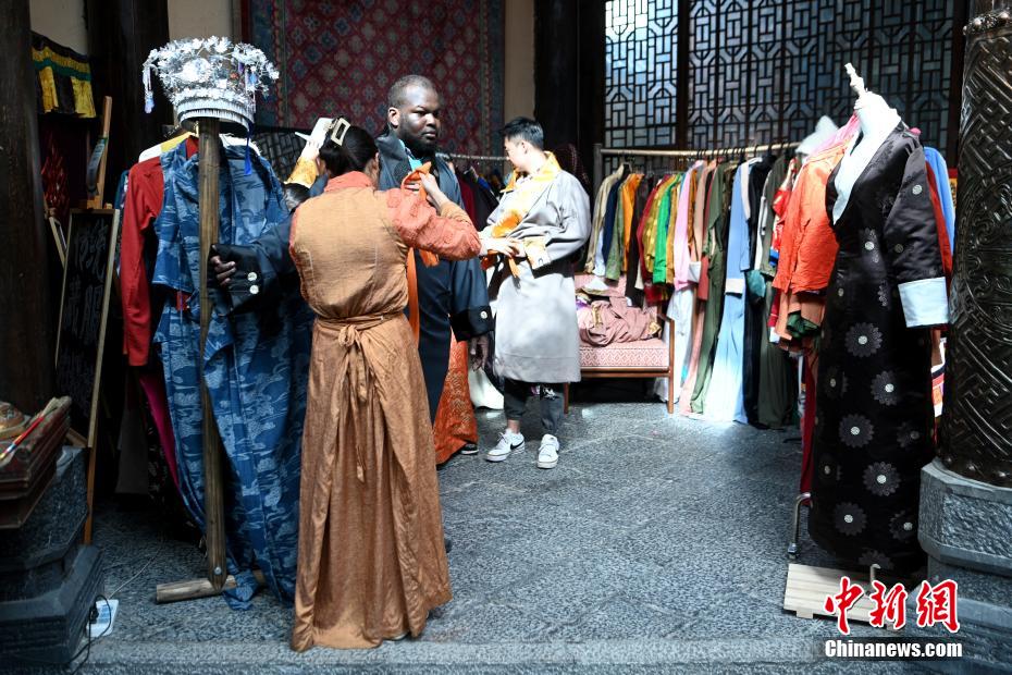 “Z世代”青年互相幫助試穿藏族服飾。李嘉嫻 攝