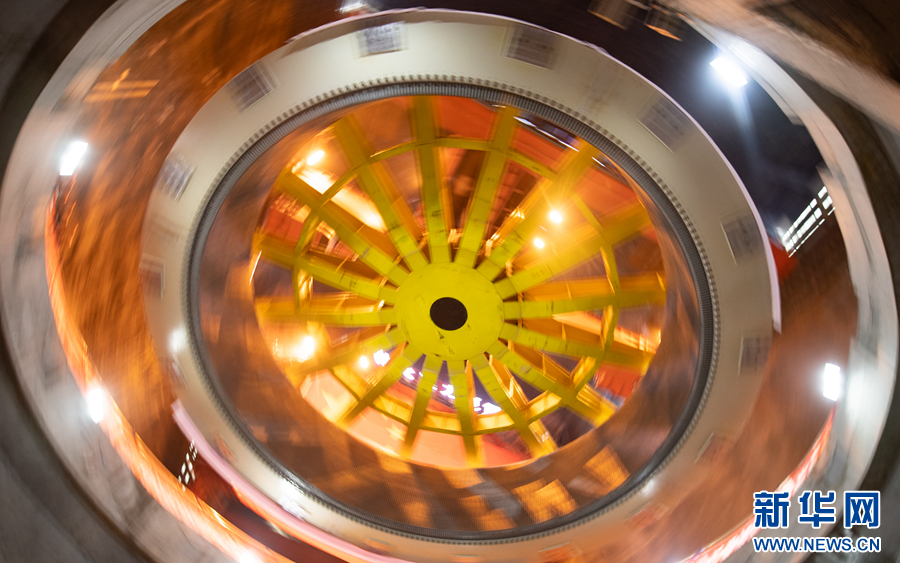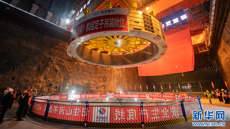 6月30日,瑪爾擋水電站地下廠房內(nèi),工作人員正在進(jìn)行首臺機組定子吊裝作業(yè)。新華網(wǎng) 潘彬彬 攝