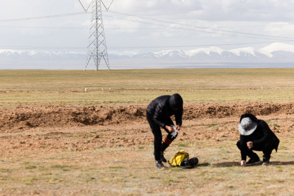 6月15日,中國(guó)科學(xué)院西北高原生物研究所研究員連新明(右)和他的學(xué)生王東在可可西里采集藏羚羊新鮮糞便樣本。