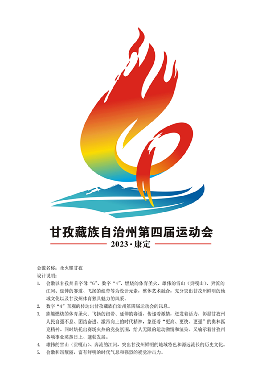 據(jù)王拓進(jìn)介紹,會徽設(shè)計(jì)靈感來自網(wǎng)上看到的貢嘎雪山,所以作品以甘孜州首字母“G”、數(shù)字“4”、燃燒的體育圣火、雄偉的雪山(貢嘎山)、奔流的江河、延伸的賽道、飛揚(yáng)的紐帶等為設(shè)計(jì)元素。數(shù)字“4”直觀地傳達(dá)出甘孜州第四屆運(yùn)動會的訊息;雄偉的雪山(貢嘎山)、奔流的江河,突出甘孜州鮮明的地域特色和源遠(yuǎn)流長的歷史文化;熊熊燃燒的體育圣火、飛揚(yáng)的紐帶、延伸的賽道,傳遞著激情、迸發(fā)著活力,彰顯甘孜州人民自強(qiáng)不息、團(tuán)結(jié)奮進(jìn)、激昂向上的時代精神,象征著“更高、更快、更強(qiáng)”的奧林匹克精神,同時烘托出賽場火熱的競技氛圍,給人無限的運(yùn)動激情和渲染,又喻示著甘孜州各項(xiàng)事業(yè)蒸蒸日上、蓬勃發(fā)展。