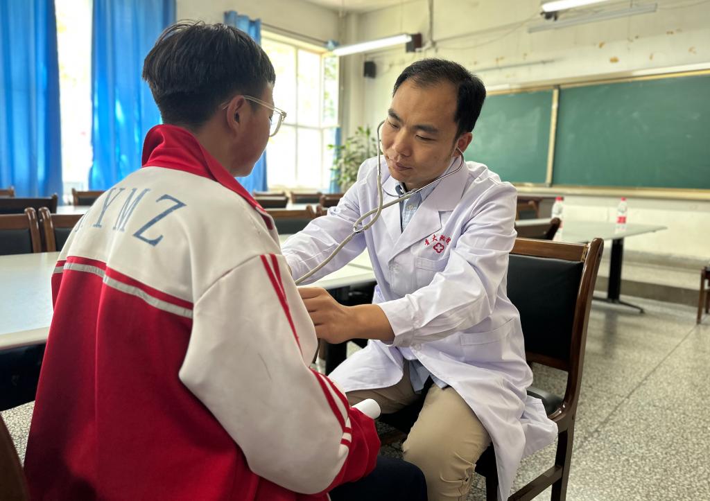 教學樓里,10名北京協(xié)和醫(yī)院的專家兩人一組,為200名學生進行骨科、眼科、兒科綜合檢查?!翱凑胺健E宕餮坨R后一定要按期復查。課間可以摘下眼鏡按摩一下,避免過度用眼。”北京協(xié)和醫(yī)院眼科專家李冰一邊拿著檢眼鏡細心檢查,一邊耐心地講解用眼知識。