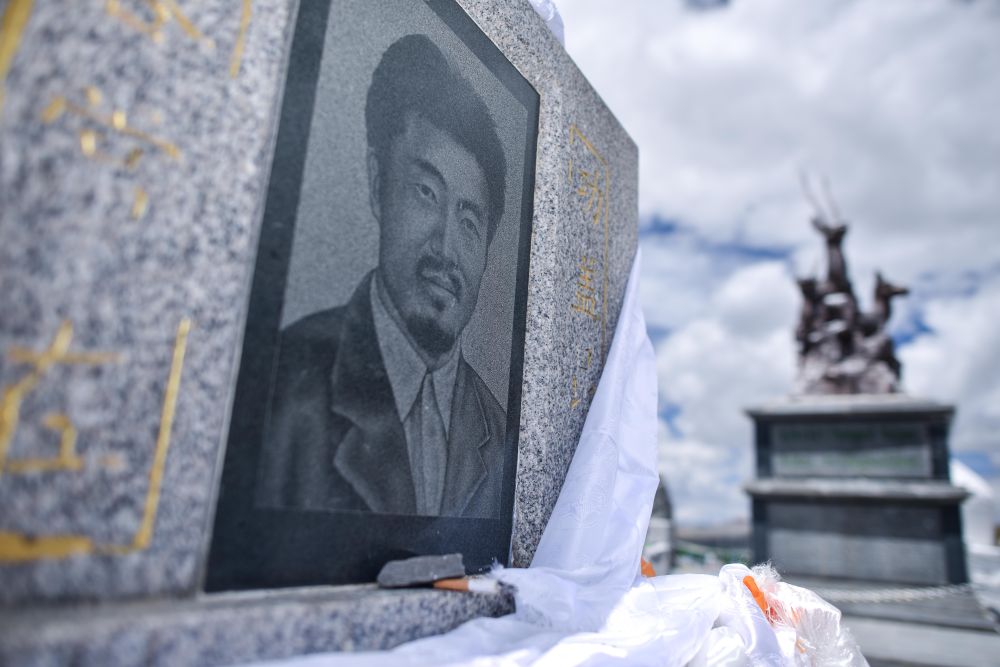 這座石碑鐫刻著杰?!に髂线_杰的名字。20多年前,為了保護瀕危的藏羚羊,他與盜獵分子槍戰(zhàn)到生命最后一刻,遺體被凍結(jié)成冰雕。
