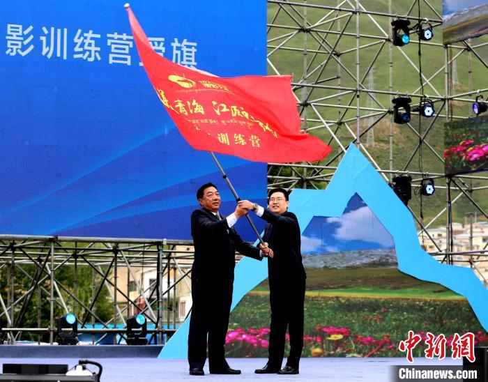 圖為中共玉樹州委副書記、宣傳部部長(zhǎng)才旦周(左)為此次“大美青海 江源玉樹”攝影訓(xùn)練營(yíng)授旗。薛蒂攝