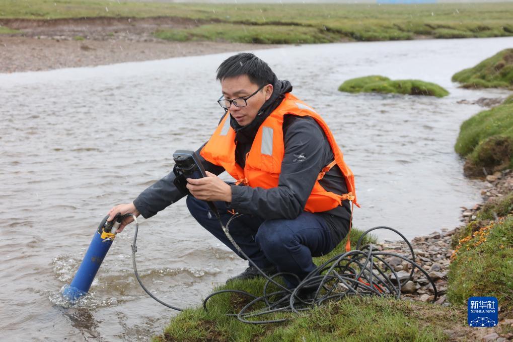 2023年江源綜合科學(xué)考察隊隊員劉敏在當(dāng)曲濕地檢測水質(zhì)(7月24日攝)。新華社記者 劉詩平 攝
