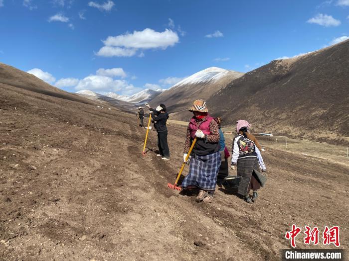 “土壤、植物和動物共同組成了完整的‘地球肌膚’系統(tǒng),恢復(fù)黑土灘需要針對不同生態(tài)層次進(jìn)行科學(xué)治理?!迸砜榻B,本次修復(fù)在今年四月進(jìn)行,首先針對土壤進(jìn)行淺刨溝、坡向垂直橫向條播,為播種創(chuàng)造合適的土壤條件,再選用披堿草、老芒麥、中華羊茅、冷地早熟禾、星星草、燕麥、紫羊茅7種本地草種,進(jìn)行比例混合,再為種子覆土,以有利于保持種子不被風(fēng)吹、流失和鳥類“偷吃”,穩(wěn)定恢復(fù)植被生長。