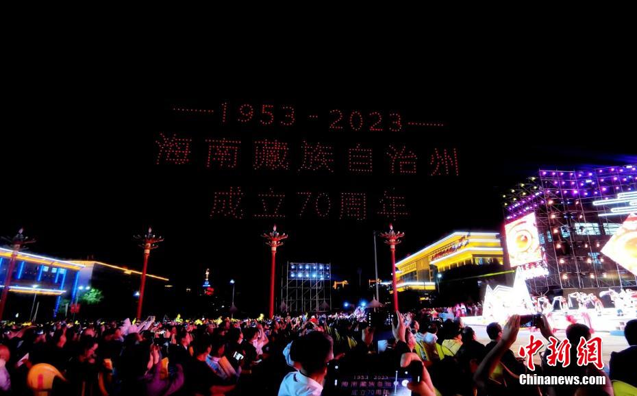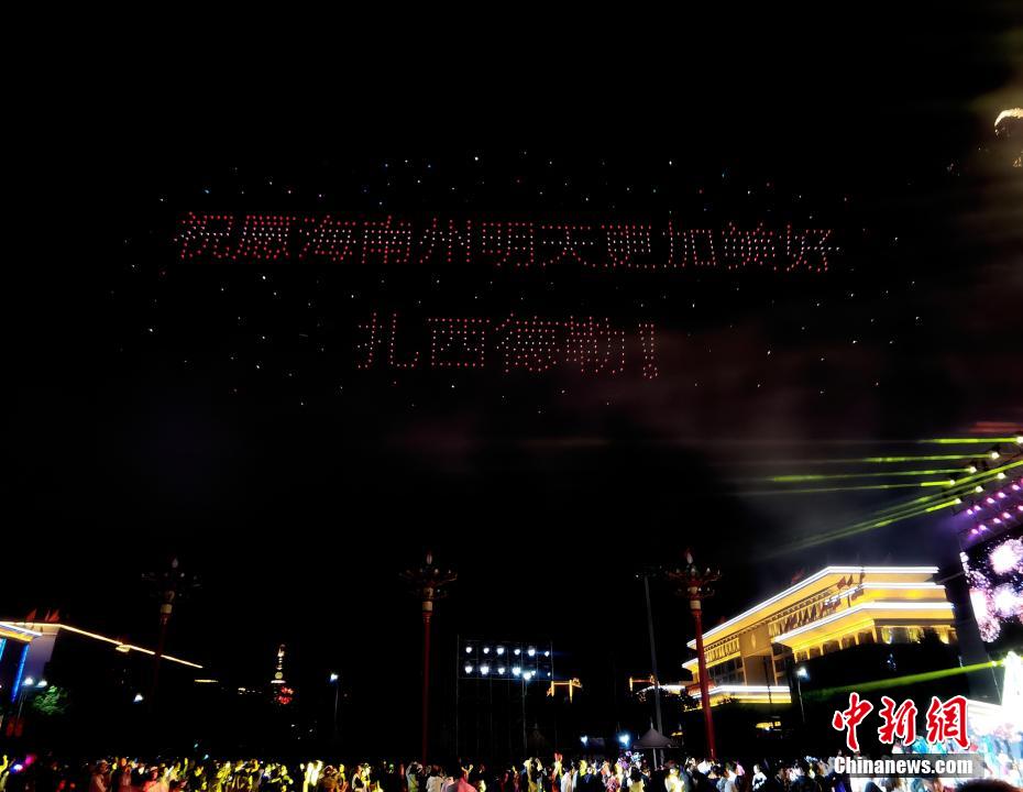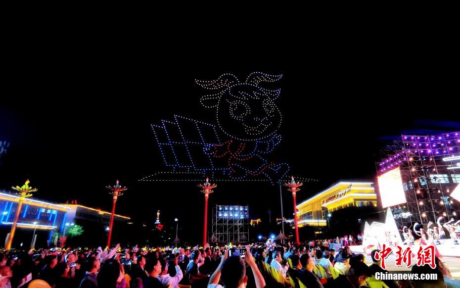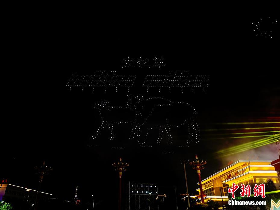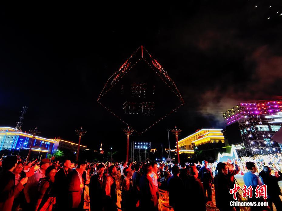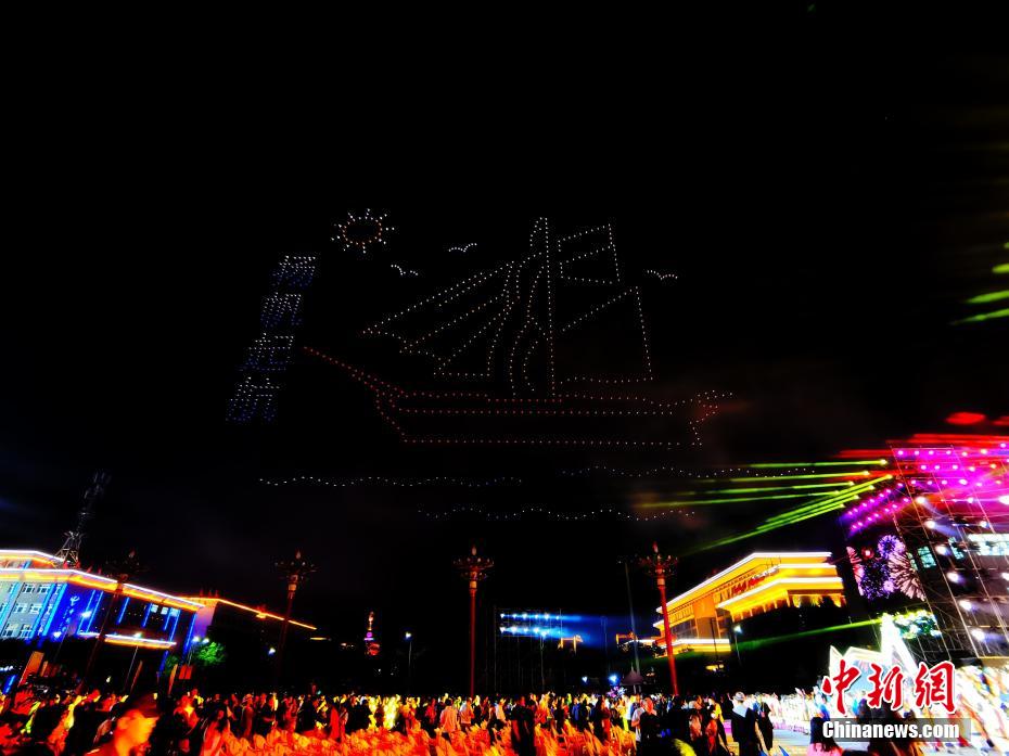 7月31日晚,青海省海南藏族自治州,800余架無人機騰空而起,以夜空為畫布,以燈光為畫筆,組成“光伏羊”“揚帆起航”“防沙治沙”“扎西德勒(藏語,意為吉祥如意)”等字樣,慶祝青海省海南藏族自治州成立70周年。