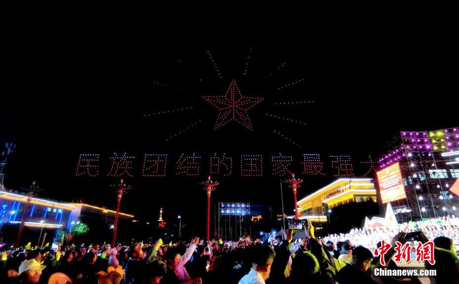 圖為無人機秀現(xiàn)場,無人機組成“民族團結的國家最團結”字樣。祁增蓓 攝