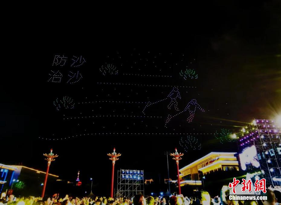 圖為無人機秀現(xiàn)場,無人機組成“防沙治沙”字樣。祁增蓓 攝