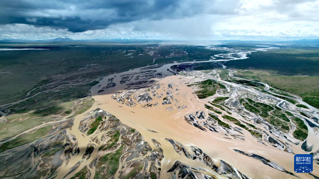 沱沱河與當(dāng)曲匯合處的囊極巴隴,辮狀河道寬度超過(guò)3千米(無(wú)人機(jī)照片)。新華社記者 劉詩(shī)平 攝