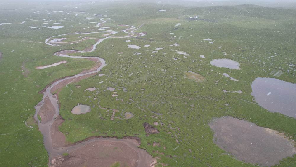 風(fēng)雪彌漫中的當(dāng)曲濕地(7月24日攝,無人機(jī)照片)。新華社記者 劉詩平 攝