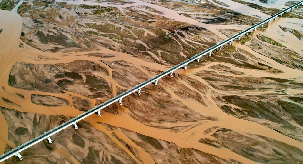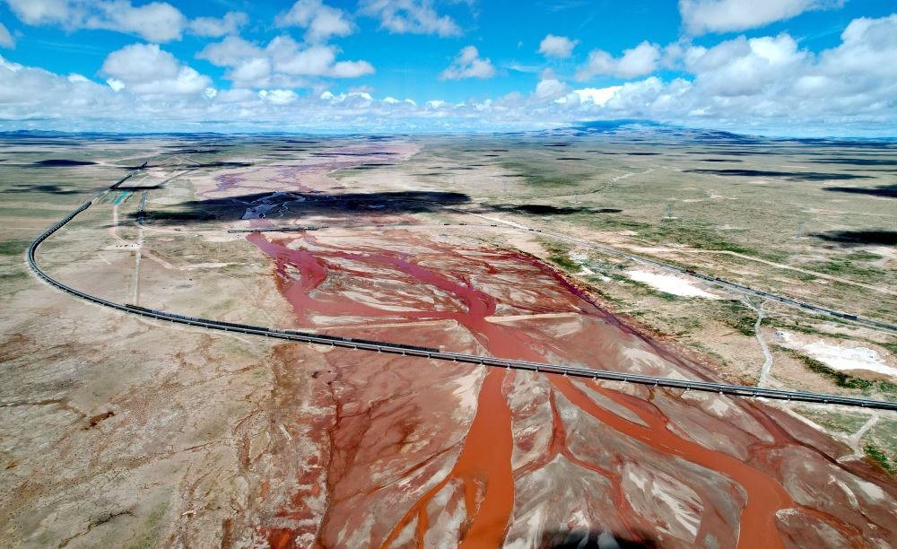 青藏鐵路通過辮狀河道的沱沱河(7月26日攝,無人機(jī)照片)。新華社記者 劉詩平 攝