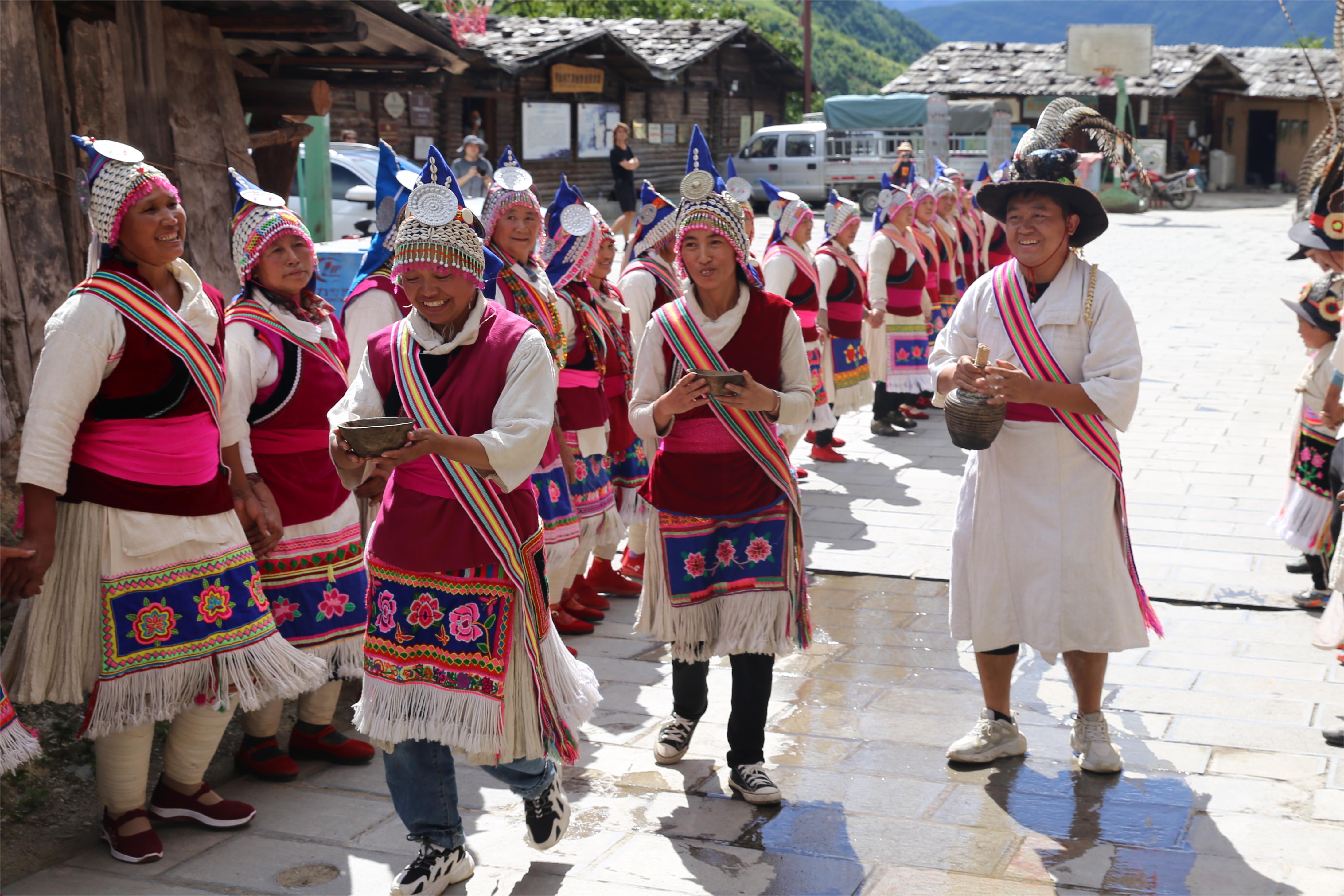 8月14日,維西縣葉枝鎮(zhèn)同樂村村民身著盛裝,跳起傈僳族特色民間歌舞阿尺目刮,歡迎遠道而來的客人。