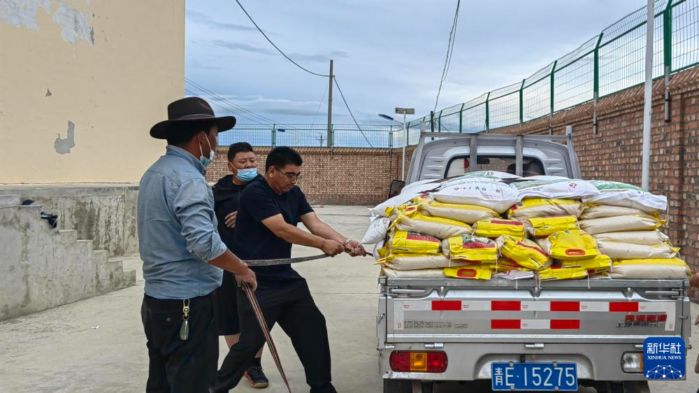 2022年8月17日,鄧官杰(左三)為同德縣唐谷鎮(zhèn)受災(zāi)群眾搬運應(yīng)急物資。同德縣應(yīng)急管理局供圖