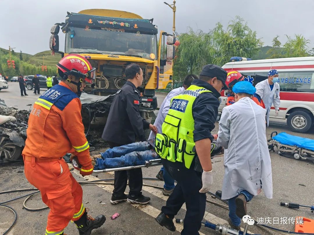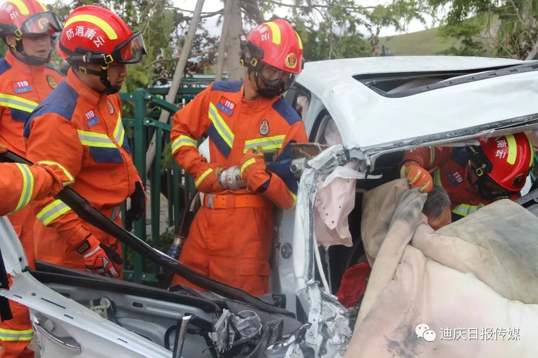 接到調(diào)令后,香格里拉消防救援站立即出動2車13人前往處置,到達現(xiàn)場后,發(fā)現(xiàn)一輛小轎車與一輛貨車相撞,轎車嚴重受損變形,車內(nèi)安全氣囊已彈出,副駕駛位被困人員頭部、腿部多處受傷無法動彈,意識模糊,有嚴重生命危險。