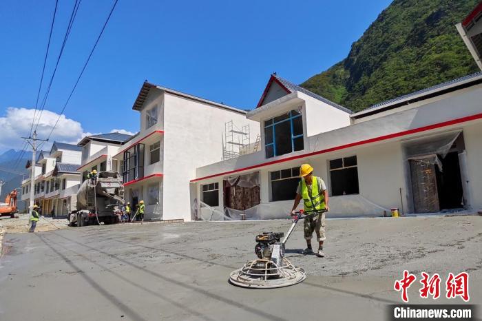 瀘定縣得妥鎮(zhèn)沙壩村村民統(tǒng)規(guī)自建房屋正在加緊屋外地面水泥鋪設(shè)。中新網(wǎng)記者 劉忠俊 攝