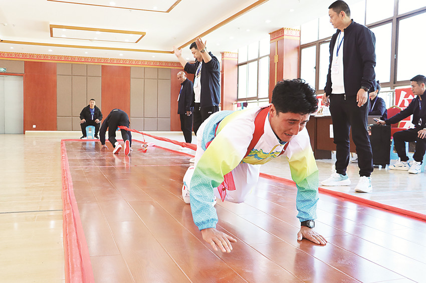 “參賽選手雙手雙腳全部著地,奮力向前拉動,不僅對選手的肩背、腰腹和腿部力量要求高,更考驗選手的爆發(fā)力和體能?!北荣愔校门虚L熊安平一邊關(guān)注著賽場,一邊向記者介紹押加比賽。