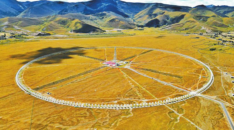 飛機從稻城亞丁機場起飛,右側(cè)舷窗外的地面隱現(xiàn)一個小圓點,因為造型特殊,當(dāng)?shù)厝朔Q“千眼天珠”。小圓點其實一點也不“小”——在海拔3820米的四川省甘孜州稻城縣噶通鎮(zhèn),313部直徑6米的天線,均勻地分布在直徑1公里的圓環(huán)上。它的正式名字叫圓環(huán)陣太陽射電成像望遠(yuǎn)鏡(下稱“圓環(huán)陣”),是國家重大科技基礎(chǔ)設(shè)施空間環(huán)境地基綜合監(jiān)測網(wǎng)(子午工程二期)的標(biāo)志性設(shè)備之一,也是目前已建成的全球規(guī)模最大的綜合孔徑射電望遠(yuǎn)鏡。其任務(wù)主要是對太陽和日地空間傳播鏈條進行高質(zhì)量監(jiān)測,監(jiān)測太陽“打噴嚏”。