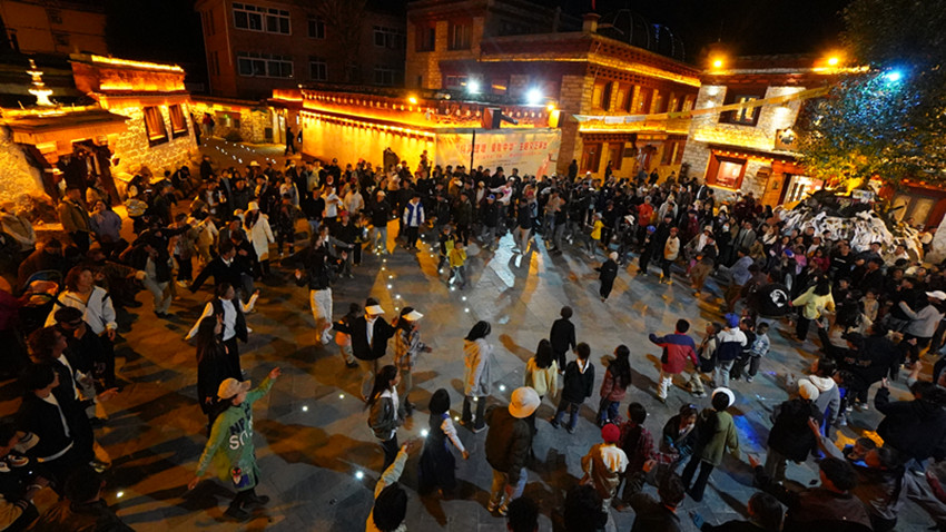 “加油、加油……”10月1日晚,在仁康小廣場(chǎng)上,遠(yuǎn)道而來的各地游客與理塘當(dāng)?shù)鼐用袢罕姸汲两诿袼谆顒?dòng)的歡樂節(jié)日氛圍中。現(xiàn)場(chǎng)邀請(qǐng)游客進(jìn)行的三人拔河比賽,掀起了活動(dòng)高潮?!斑@里的氛圍讓我感到很舒服,也祝祖國母親生日快樂?!眮碜躁兾魑靼驳挠慰忘S家樂說。伴隨著各族群眾手拉手跳起的鍋莊舞,游客和群眾深切感受到民族大團(tuán)結(jié)的溫暖。