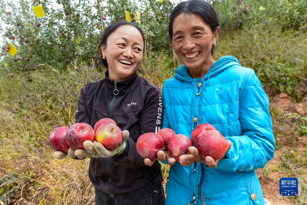 10月13日,在鄉(xiāng)城縣“蘋果+藏豬”種養(yǎng)循環(huán)現(xiàn)代農(nóng)業(yè)園區(qū)內(nèi)的有機蘋果種植示范基地,當?shù)夭刈迦罕娞ㄗ螅┖筒馗裾故静烧奶O果。新華社記者 黃曉勇 攝
