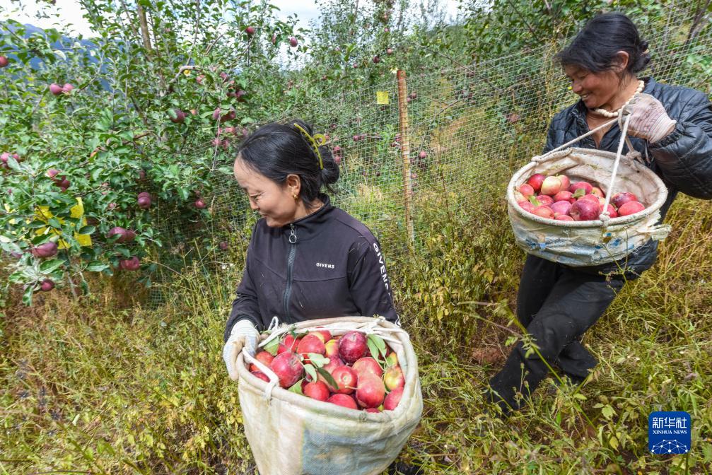 10月13日,在鄉(xiāng)城縣“蘋果+藏豬”種養(yǎng)循環(huán)現(xiàn)代農(nóng)業(yè)園區(qū)內(nèi)的有機蘋果種植示范基地,當?shù)夭刈迦罕娞ㄗ螅┖吐褰q抱著采摘的蘋果下山。新華社記者 黃曉勇 攝