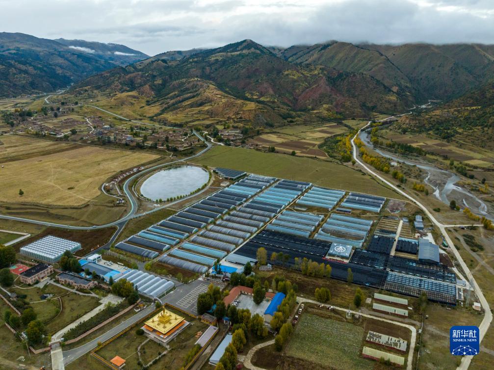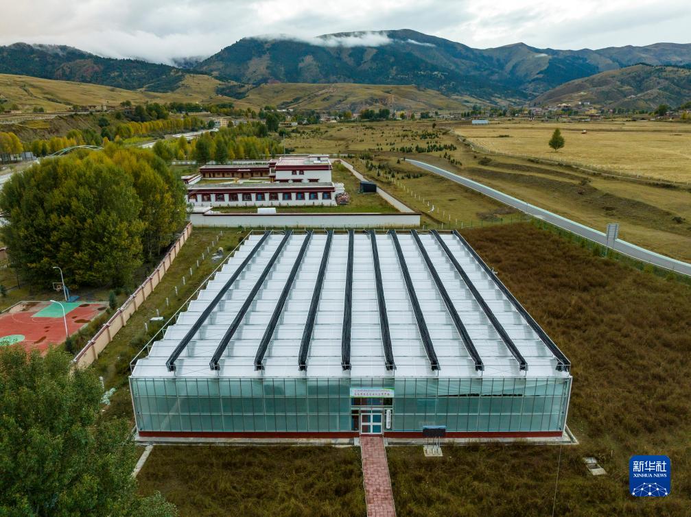 這是10月13日在理塘縣瑪吉阿米花園農(nóng)莊拍攝的智慧農(nóng)業(yè)無土栽培館(無人機照片)。新華社記者 沈伯韓 攝