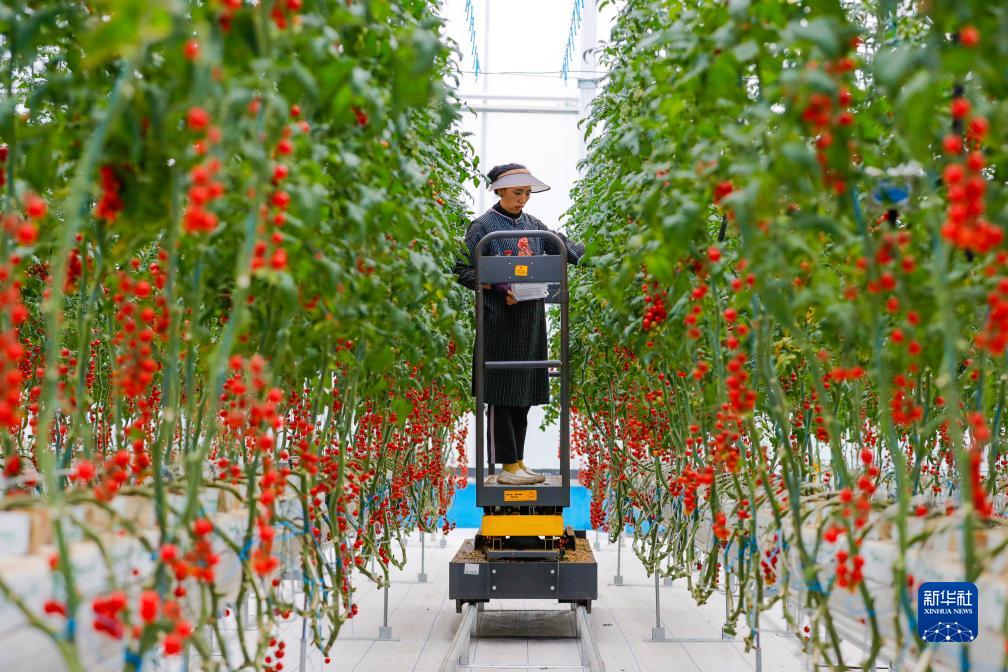 10月13日,在理塘縣瑪吉阿米花園農(nóng)莊的智慧農(nóng)業(yè)無土栽培館,當?shù)夭刈迦罕姴烧t色小番茄。新華社記者 黃曉勇 攝