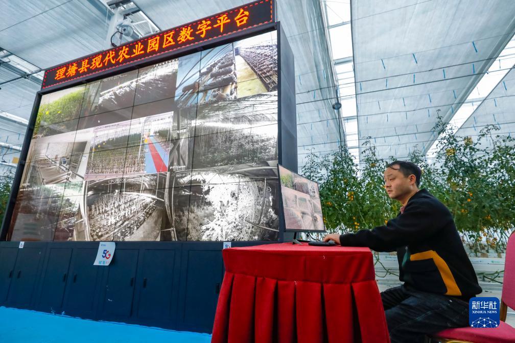 10月13日,理塘縣瑪吉阿米花園農(nóng)莊負責(zé)人丁義通過理塘縣現(xiàn)代農(nóng)業(yè)園區(qū)數(shù)字平臺查看農(nóng)莊不同區(qū)域的運轉(zhuǎn)情況。新華社記者 沈伯韓 攝
