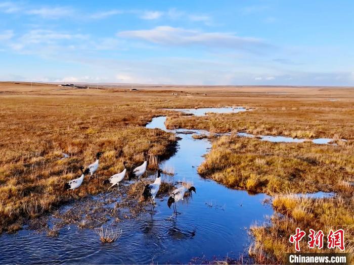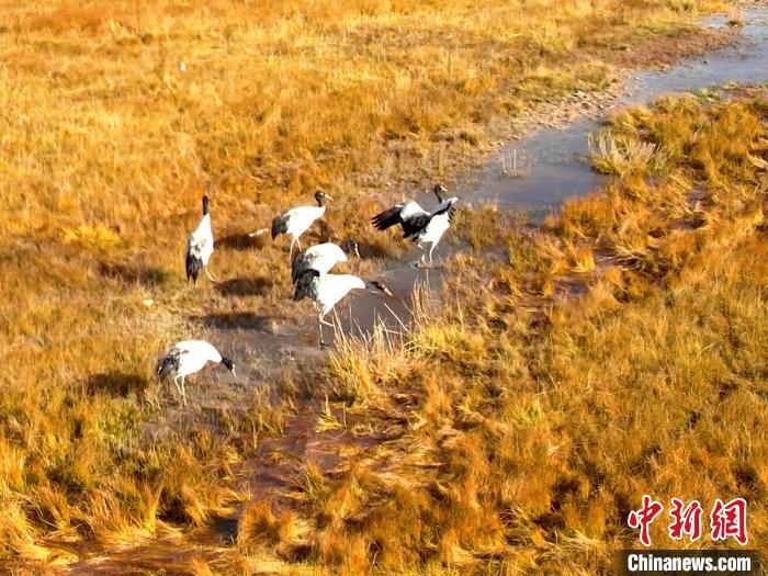 金秋十月,位于青海湖北岸的草原一片金黃。攝影愛好者在青海省海北藏族自治州剛察縣吉爾孟鄉(xiāng)日格加柔地區(qū),拍攝到六只黑頸鶴在這里“安家落戶”,它們或擠在一起沐浴秋日的暖陽,或三五成群覓食嬉戲、閑庭信步,為草原增添了一份靈動與生機。黑頸鶴被稱為“高原仙子”“鳥類大熊貓”,是全球十五種鶴類中唯一在高原繁殖和棲息的鶴類。