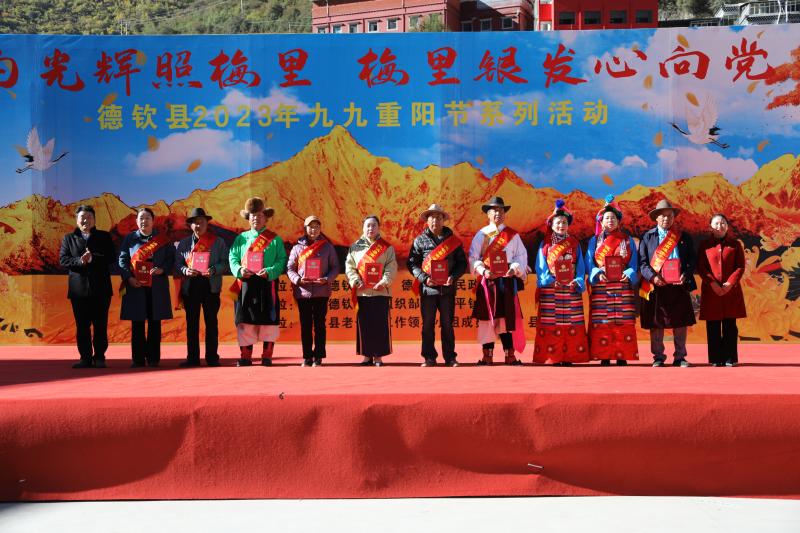 活動中,德欽縣縣委、政府負(fù)責(zé)人分別為2023年德欽縣“黨的光輝照梅里 梅里銀發(fā)心向黨”重陽節(jié)系列慶?;顒又罗o,并通報了德欽縣2023年經(jīng)濟社會發(fā)展情況。