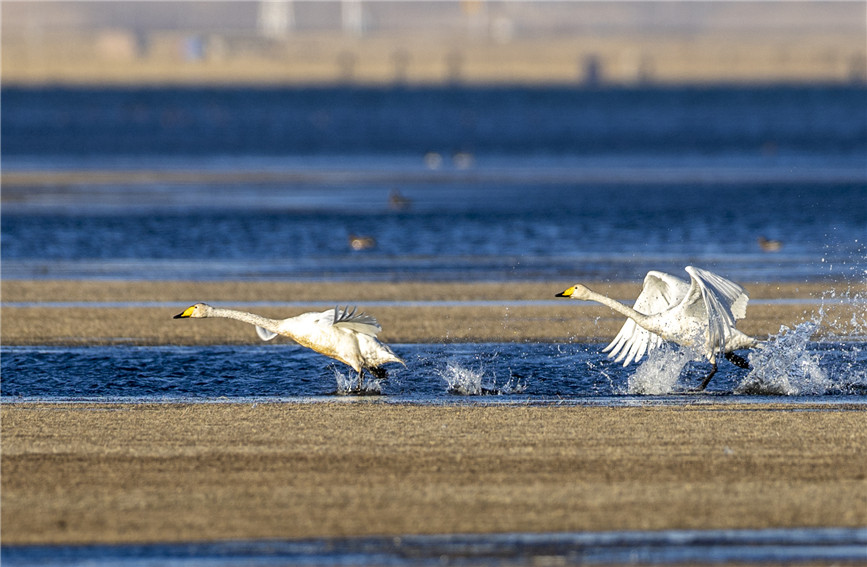 天鵝撲打著翅膀,濺起陣陣漣漪。楊濤 攝