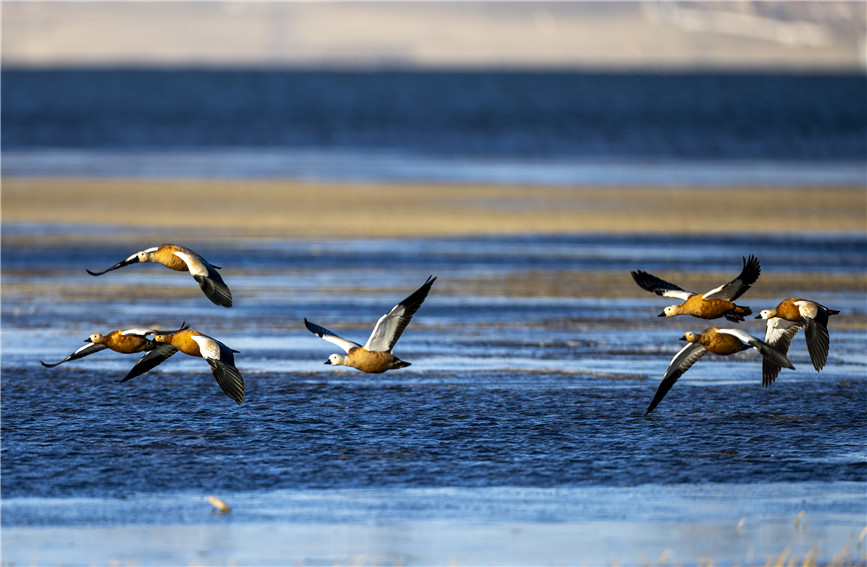 湖面上成群結(jié)隊(duì)的赤麻鴨紛紛翔集,時(shí)而靜臥水面,時(shí)而振翅齊飛、時(shí)而追逐嬉戲、時(shí)而潛水覓食,場(chǎng)面蔚為壯觀,為初冬的青海湖帶來了美麗的色彩和無限生機(jī)。