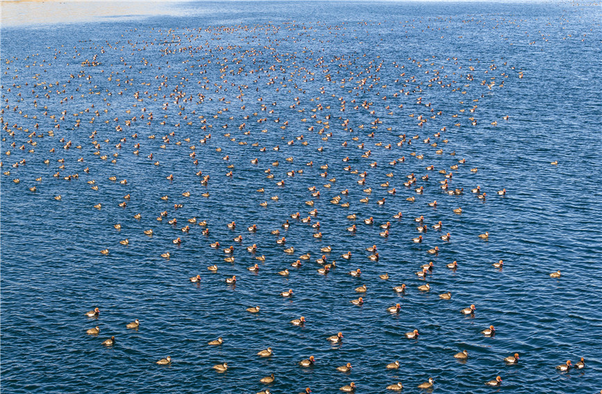 成群結(jié)隊(duì)的赤嘴潛鴨在湖面嬉戲。楊濤 攝
