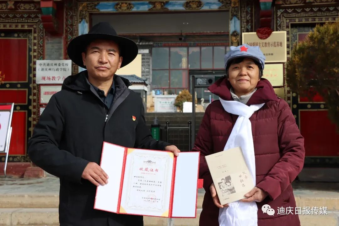 迪慶紅軍長(zhǎng)征博物館館長(zhǎng)潘高原代表博物館接收了這些珍貴的革命資料、實(shí)物,向他們授予了榮譽(yù)證書并在博物館前合影留念。