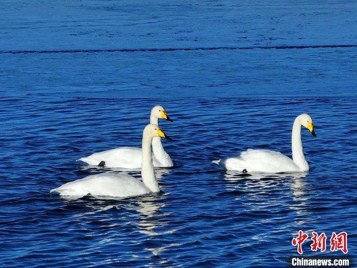 圖為成群大天鵝在青海湖中游弋休憩。包雷 攝