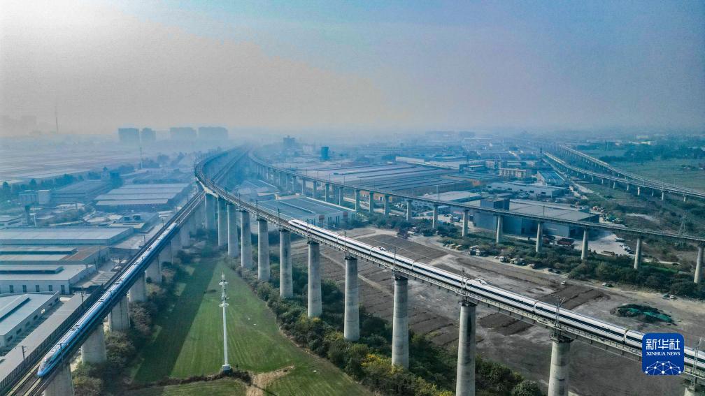11月28日,在成都市青白江區(qū)境內(nèi)拍攝的行駛在川青鐵路上的列車(上)和行駛在西成高鐵線上的列車(下)(無人機(jī)照片)。新華社記者 王曦 攝