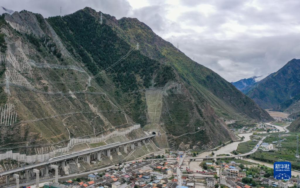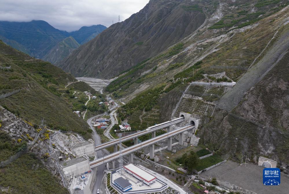 調(diào)試列車駛?cè)氪ㄇ噼F路茂縣站(10月13日攝,無人機(jī)照片)。新華社記者 王曦 攝